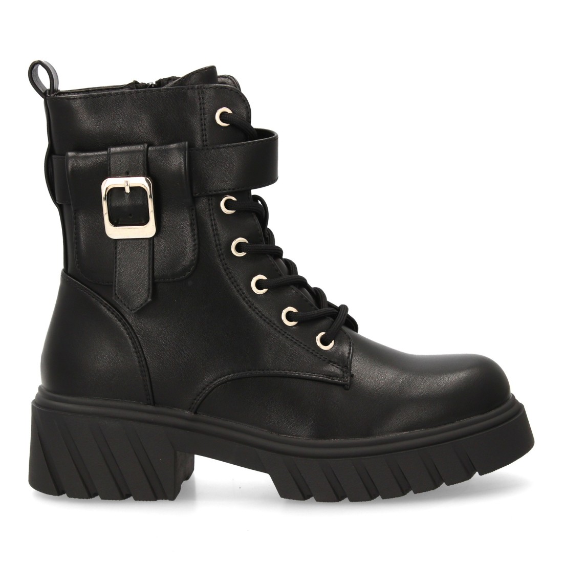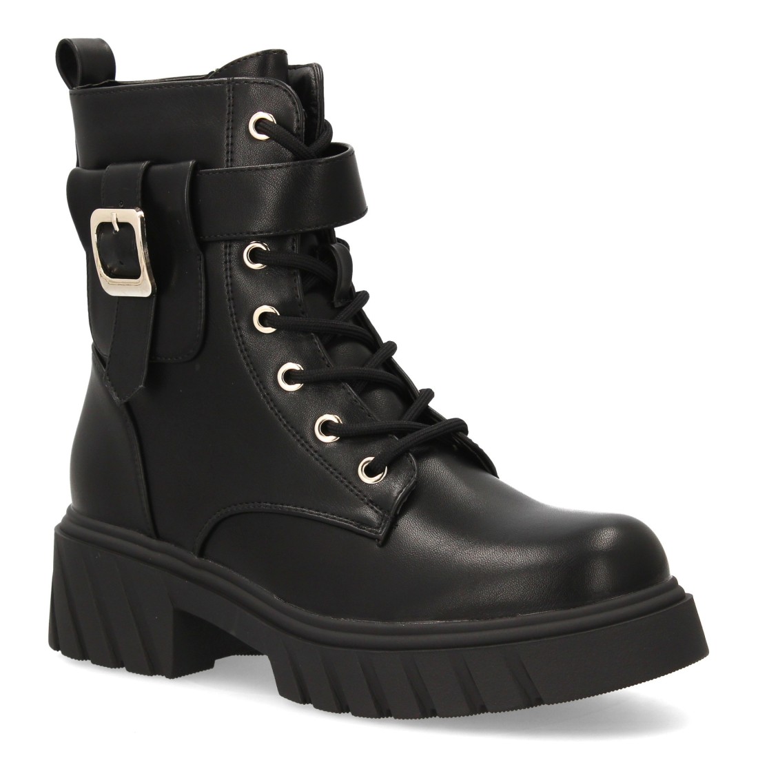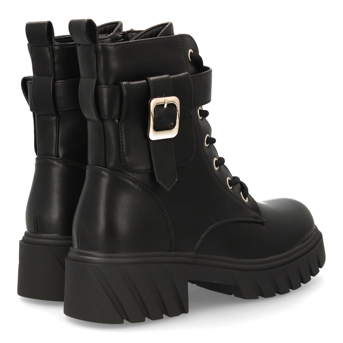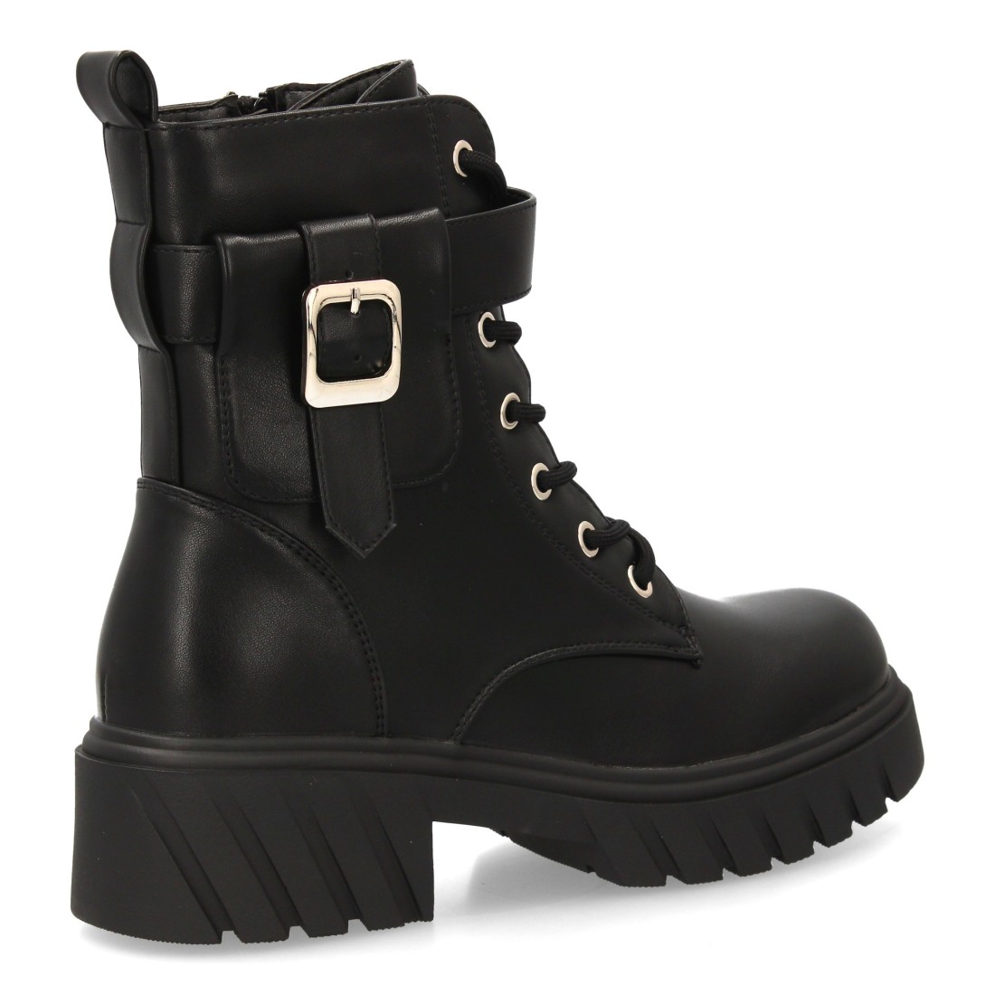 Botín militar con hebilla decorativa y diseño moderno.