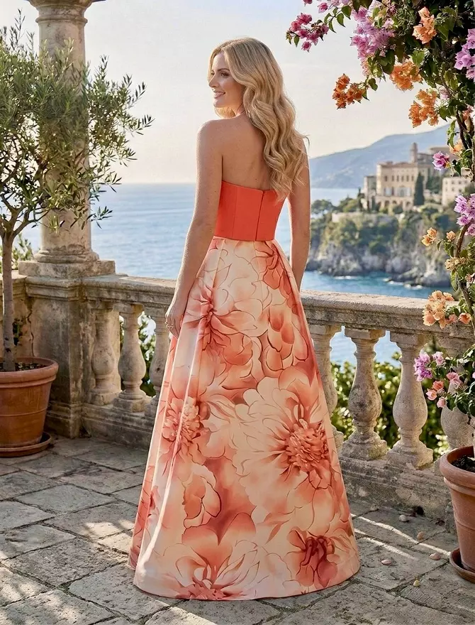 El vestido largo Laura es esa pieza especial que combina la intensidad del los colores lisos con un estampado floral que no pasa desapercibido.