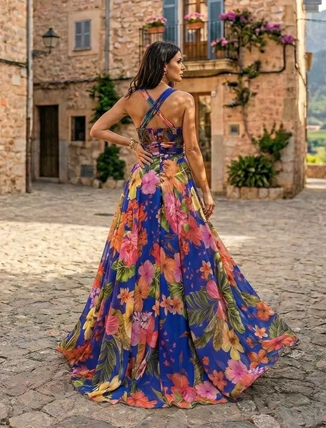 Si buscas una pieza que hable por sí sola, el Vestido Miriam es, sin duda, ese diseño que se roba todas las miradas. Su punto fuerte es un imponente vuelo de 7 metros de diámetro, pensado para crear un efecto espectacular al caminar o bailar; es puro movimiento y ligereza sobre un fondo azul vibrante que rebosa vida.